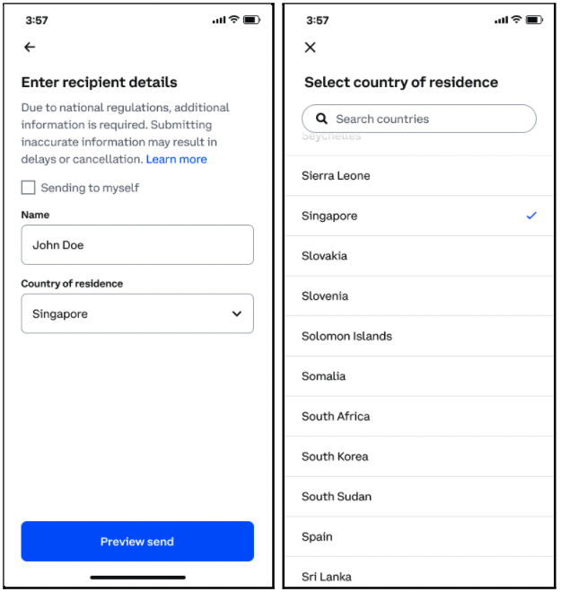 Los usuarios de Singapur no necesitarán proporcionar la dirección residencial del destinatario, pero solo requerirán el nombre y el país de residencia del destinatario. La falta de cualquier información requerida impedirá que el usuario envíe criptomonedas fuera de la plataforma Coinbase para las jurisdicciones en cuestión.