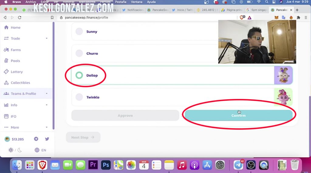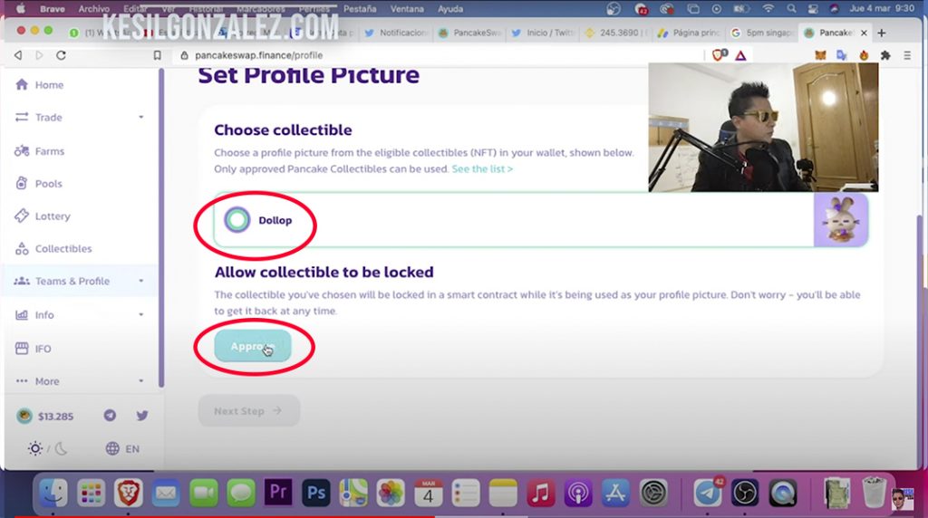Teraz masz grafikę, która jest NFT w Twoim portfelu. Dalej, trzeba przejść do PancakeSwap, aby aktywować profil, umieść ten NFT w inteligentnej umowie, aby zacząć czerpać korzyści, gdy nie chcesz już mieć profilu, możesz go odzyskać bez problemu, teraz wybierzemy nasz NFT i kliknij Potwierdź (Aprove) i zapłać prowizję w wysokości około 0,19 USD za pomocą BNB.
